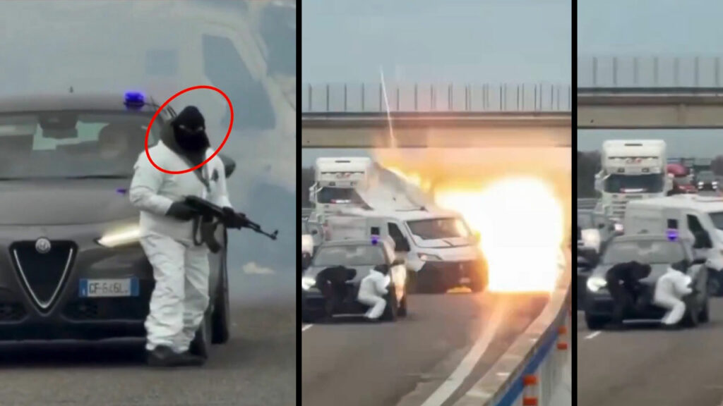 Un jaf impresionant a fost pus la cale de o bandă de infractori înarmați, care s-au deghizat în forțe de ordine, folosind vehicule echipate cu semnale luminoase specifice poliției. Aceștia au provocat o barieră pe drum prin incendierea unui autovehicul, forțând astfel un furgon blindat să se oprească. În imaginile surprinse, se observă cel puțin șase indivizi înarmați, unii îmbrăcați în ținute de culoare închisă, iar alții purtând combinezoane albe și măști faciale, conform raportului de la Il Post.